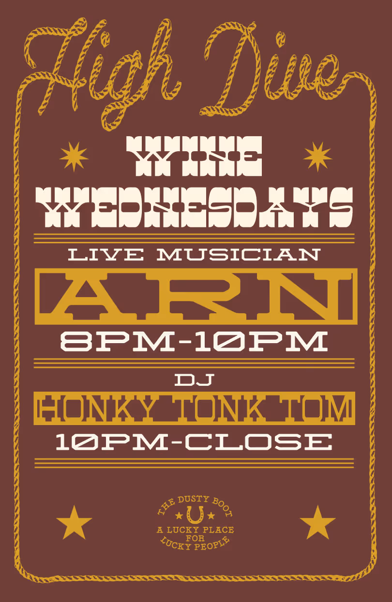 Live Musician Arn 8pm-10pm DJ Honky Tonk Tom 10pm-Close Half Price Wine Bottles